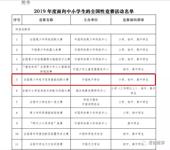 2019年教育部為了規(guī)范管理中小學(xué)生競賽活動(dòng),印發(fā)《關(guān)于面向中小學(xué)生的全國性競賽活動(dòng)管理辦法(試行)的通知》,并于4月發(fā)布了《2019年度面向中小學(xué)生的全國性競賽活動(dòng)名單》。名單包括了29項(xiàng)中小學(xué)競賽活動(dòng)。中國電子學(xué)會(huì)主辦的全國青少年電子信息智能創(chuàng)新大賽位于名單第5位。