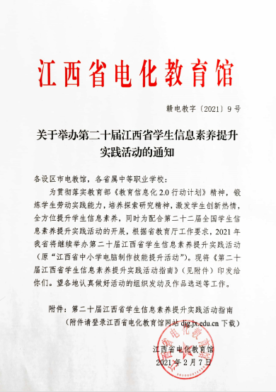 江西省電教館2021年2月7日發(fā)布第二十屆江西省學(xué)生信息素養(yǎng)提升實(shí)踐活動(dòng)的通知,思創(chuàng)優(yōu)學(xué)連續(xù)三年為無人機(jī)賽事的技術(shù)支持單位。