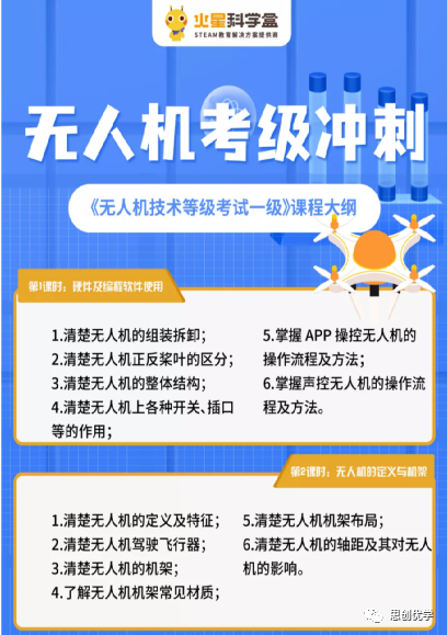 火星科學(xué)盒推出了“無人機(jī)等級(jí)考試”、“無人機(jī)障礙競技賽”、“無人機(jī)圖形化編程挑戰(zhàn)賽”系列課程。