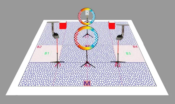 比賽在室內(nèi)場(chǎng)地進(jìn)行,地圖尺寸區(qū)域?yàn)?.5m×4.5m,場(chǎng)地比賽區(qū)域?yàn)?m×4m大小,設(shè)有A、B、C三個(gè)區(qū)域,如圖3所示。