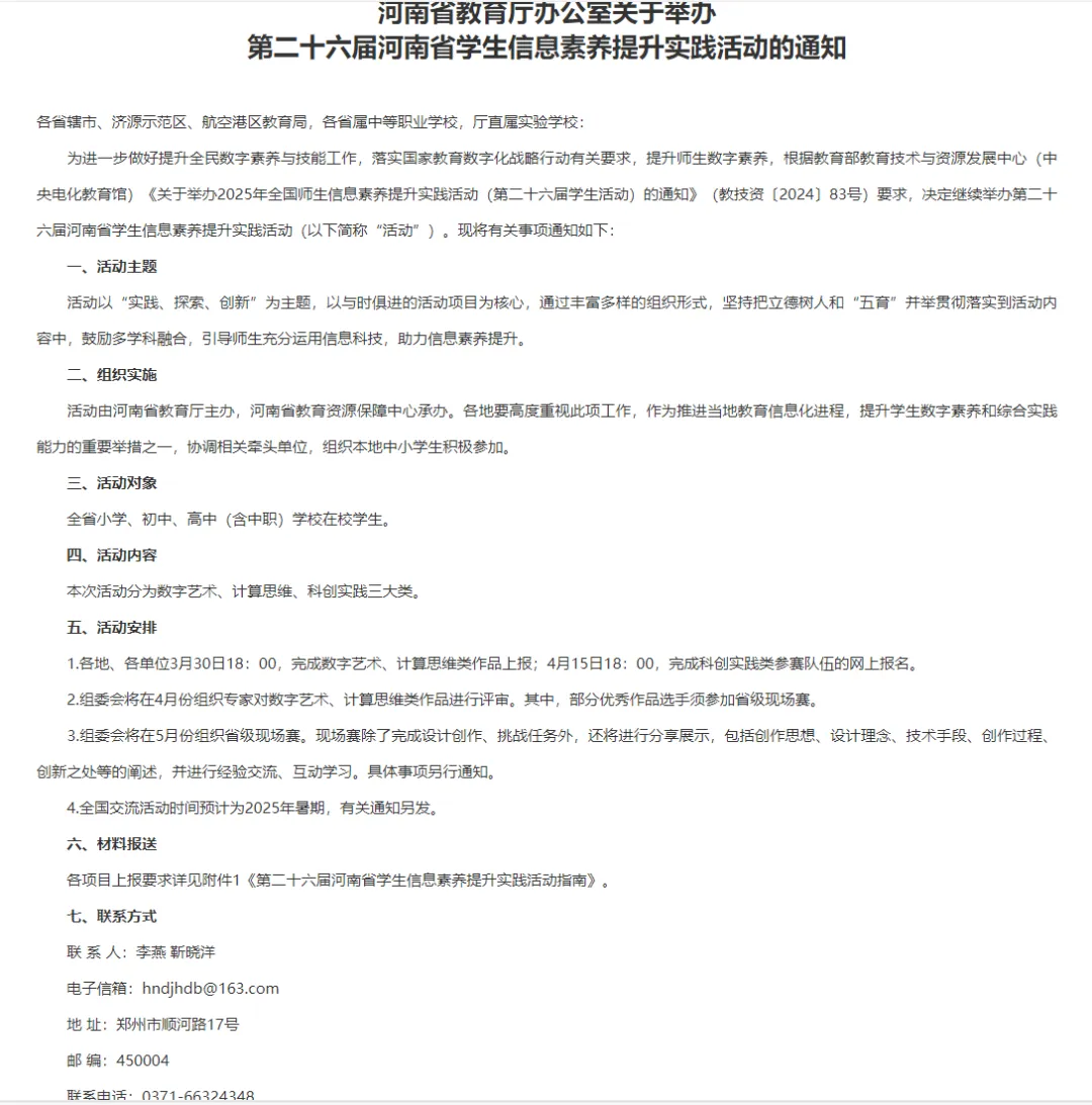 (二)2025年3月30日18:00,各地、各單位完成數(shù)字藝術(shù)類和計(jì)算思維類作品省級(jí)上報(bào);4月15日18:00完成科創(chuàng)實(shí)踐隊(duì)伍省級(jí)報(bào)名。提示:活動(dòng)平臺(tái)http://hd.hner.cn 3月1日開放上傳入口。