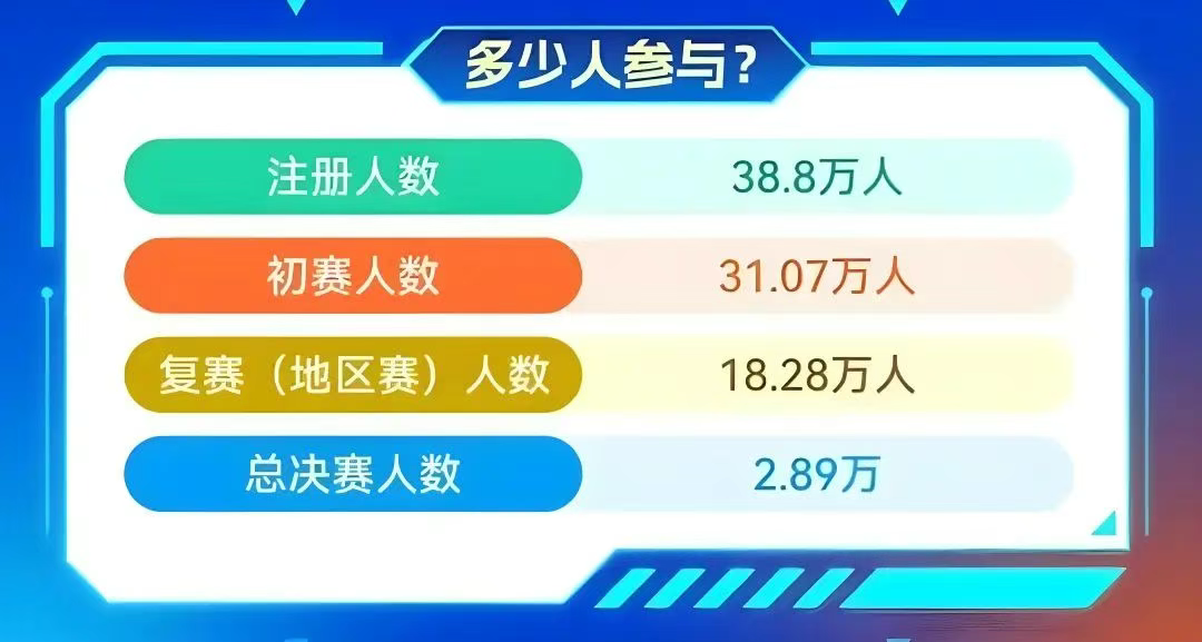2025年第十一屆全國(guó)青少年信息素養(yǎng)大賽,共計(jì)38.8萬(wàn)選手報(bào)名參加,31.07萬(wàn)參與初賽,18.28萬(wàn)進(jìn)軍復(fù)賽,2.89萬(wàn)走入總決賽,選手、老師、家長(zhǎng)等共7萬(wàn)余人聚集烏鎮(zhèn)。