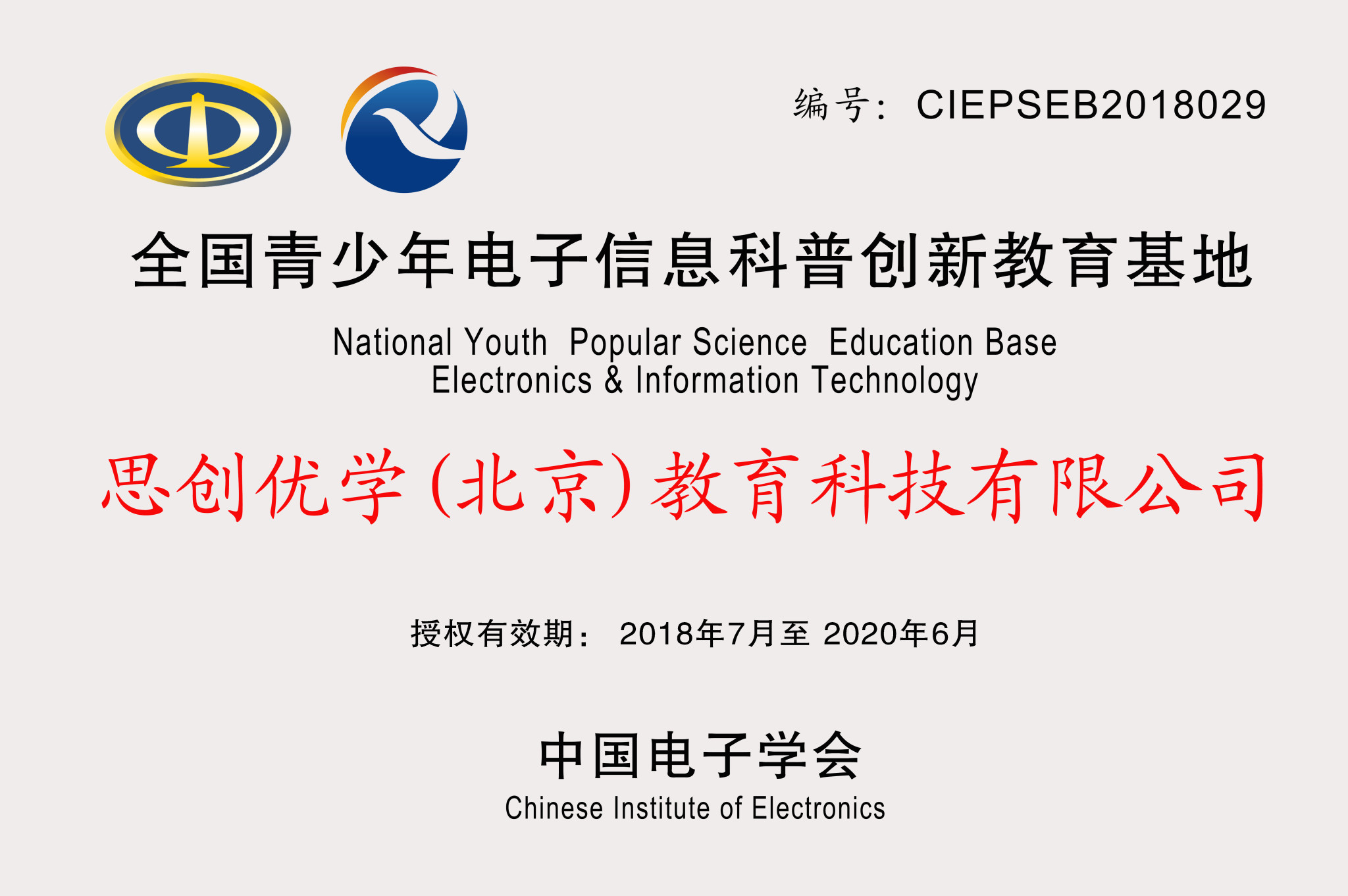 中國電子學(xué)會授予思創(chuàng)優(yōu)學(xué)(北京)教育科技有限公司全國青少年電子信息科普創(chuàng)新教育基地