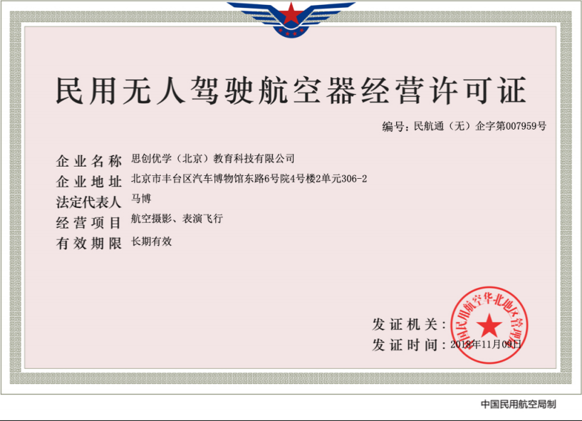 思創(chuàng)優(yōu)學(xué)(北京)教育科技有限公司獲民用無人駕駛航空器經(jīng)營許可證