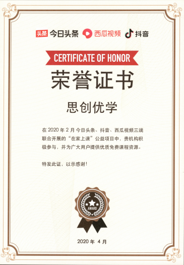 思創(chuàng)優(yōu)學(xué)榮譽證書